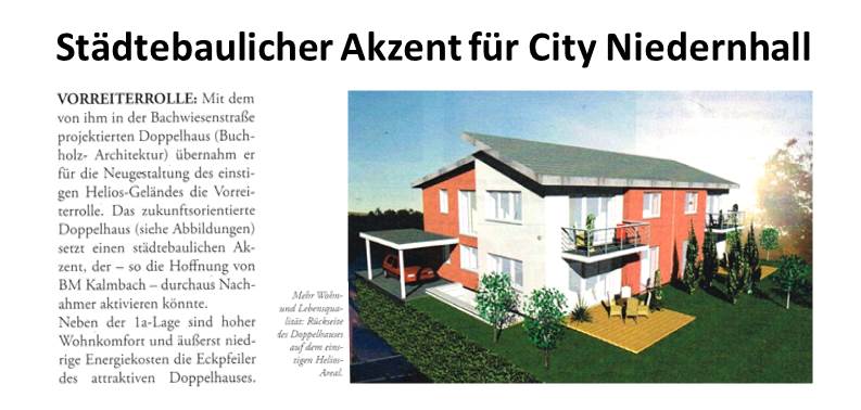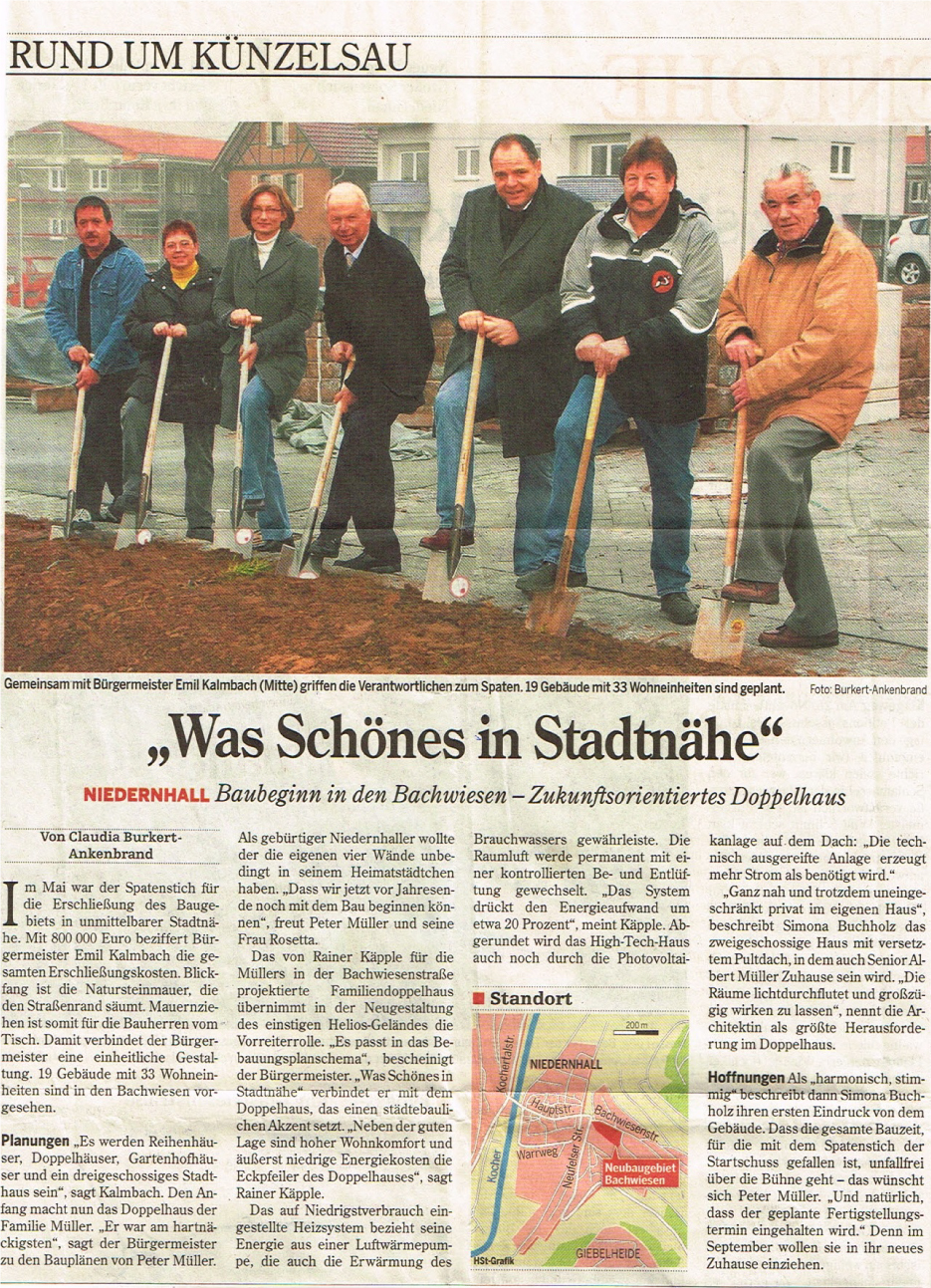 Das von Buchholz-Architektur geplante zukunftsorientierte Doppelhaus macht den Anfang im neuen Baugebiet „Bachwiesen“ in unmittelbarer Zentrumsnähe in Niedernhall. Gemeinsam mit Bürgermeister Emil Kalmbach greifen Bauherren, die Verantwortlichen und Gäste zum Spaten.